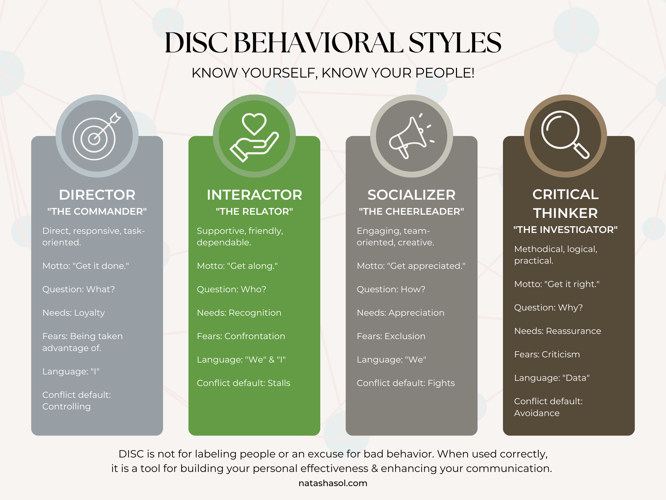 Tools such as the DISC behavioral styles (pictured in the graphic below), the five Love Languages, and even insights from astrology or the Chinese zodiac can provide valuable information on how people interact, helping you better understand the people around you. When you learn to communicate with coherent intention—rather than from fear or reaction—you restore flow, harmony, and vitality within both your relationships and your body.
